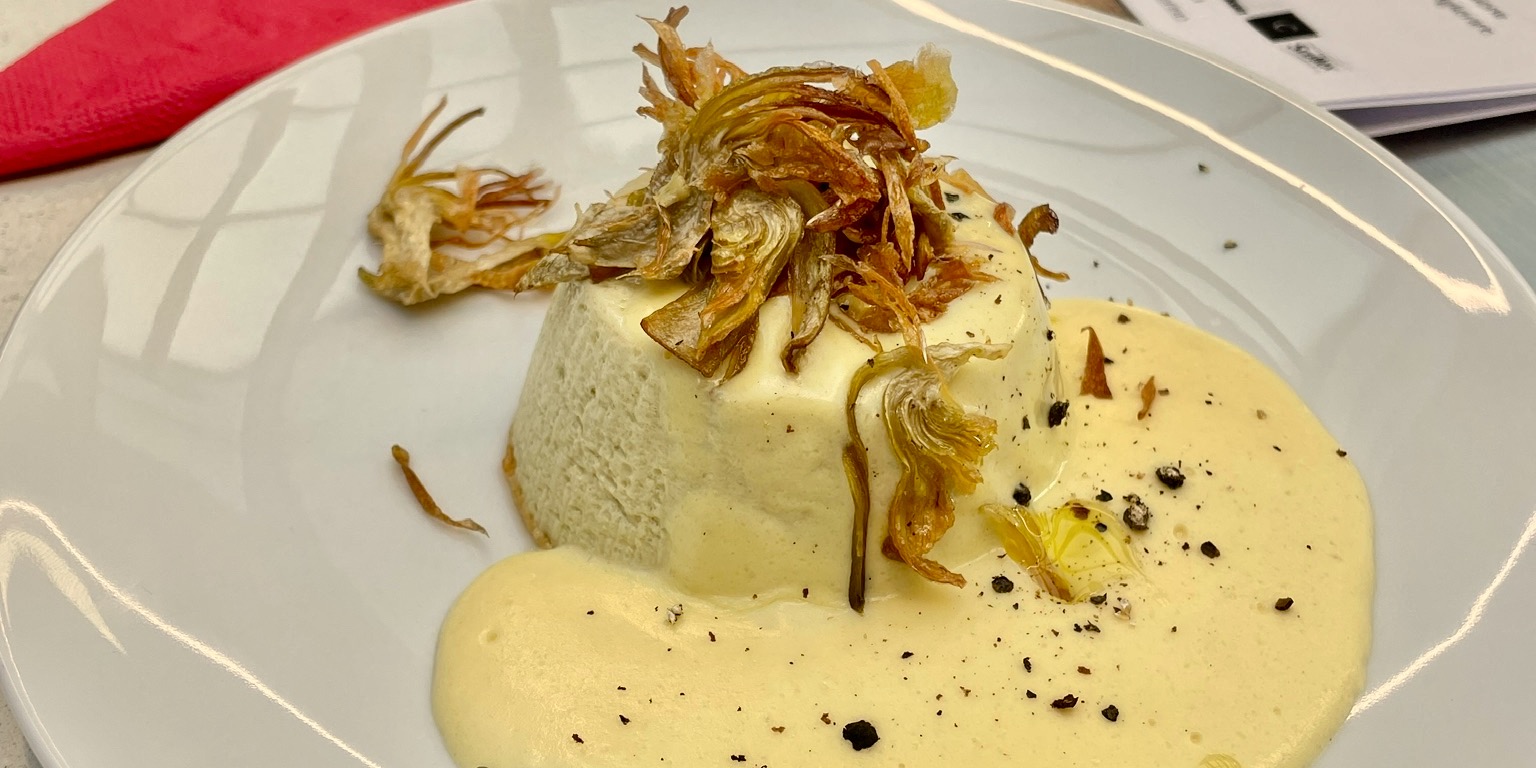 Flan di cardi con carciofi croccanti e fonduta di toma