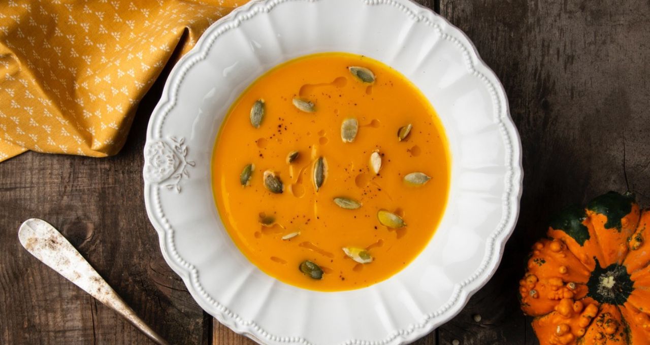 Prima di servire la vellutata, rifiniscila con una macinata di pepe e dei semi di zucca.