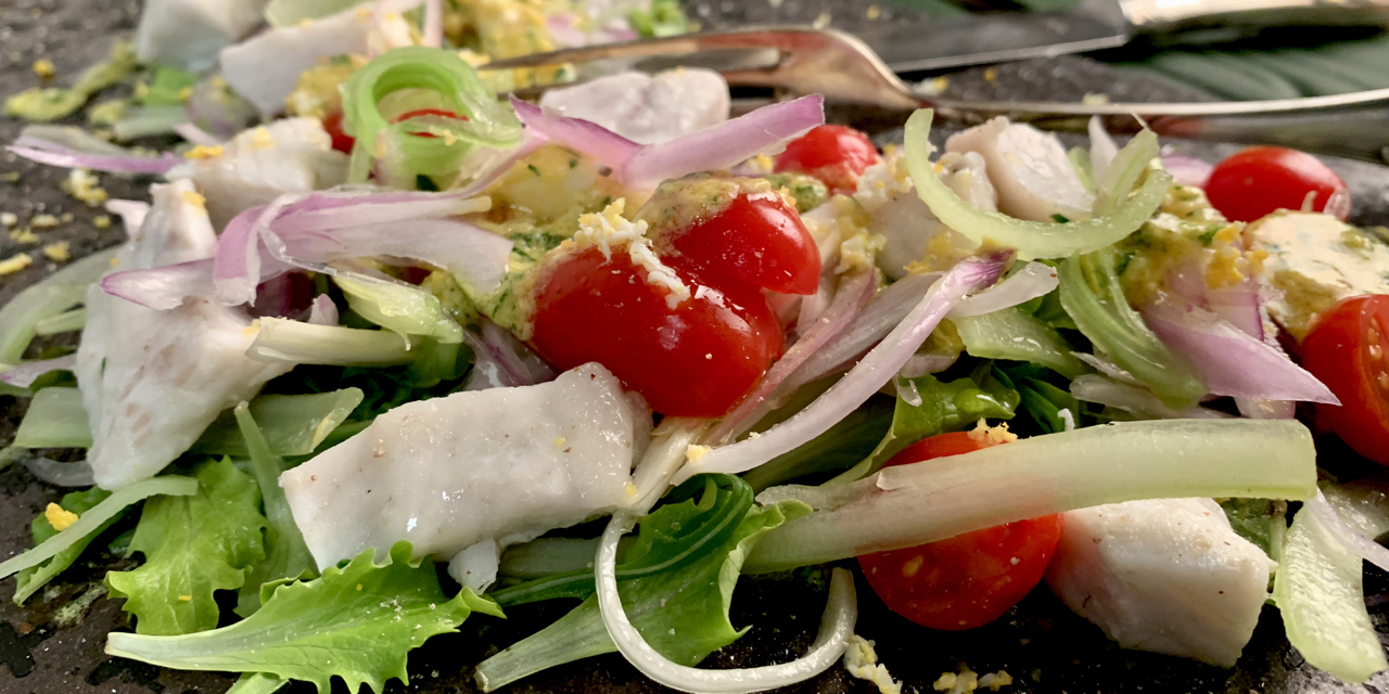 Disponi nel piatto il rombo cotto a vapore a 100°C per 12 minuti circa e al centro la valeriana, il sedano, i pomodorini e la cipolla.